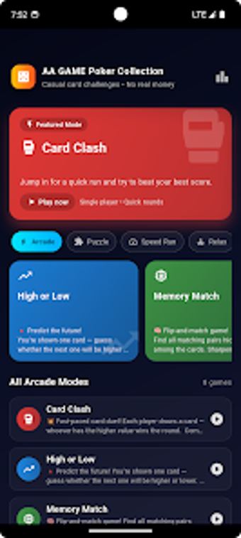 AA GAME Poker Collection est une application de jeux sur Android qui propose une expérience variée grâce à une collection de mini-jeux de cartes. Cette application gratuite se distingue par ses huit modes de jeu différents, permettant aux utilisateurs de choisir entre des parties décontractées ou des défis de scores élevés. Chaque mode offre une dynamique unique, rendant le jeu accessible à tous, qu'ils soient novices ou joueurs expérimentés.
